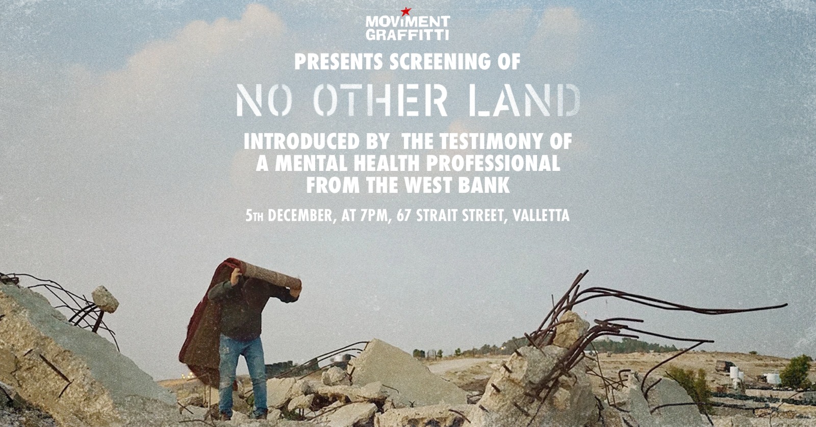 Film Screening: No Other Land Introduced by the testimony of Suheir T. from the West Bank On Friday 5 December, we will meet at the Moviment Graffitti premises at 67 Strait Street, Valletta, for the screening of the film No Other Land. The film offers a direct testimony of the challenges faced by Palestinians living […]