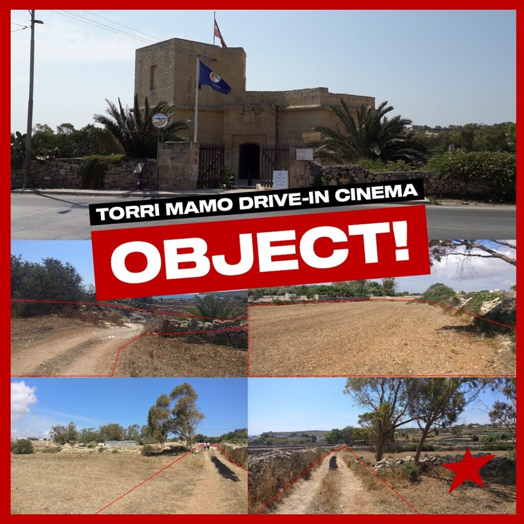 The application proposes the removal of soil from the land to make way for roughly 56 car spaces as well as an inflatable 16:8 metre screen, robbing Marsascala of some of its last precious remaining greenery.