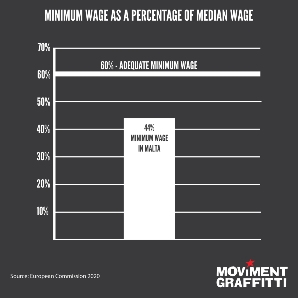 Moviment Graffitti believes that the Government should, at least, raise the minimum wage up to the adequacy level mentioned in the directive. This will not only boost the economy with much-needed spending, but will also increase the pay for thousands of workers who earn slightly higher than the minimum wage. Moviment Graffitti still believes that the minimum wage should be equal to the living wage as every worker deserves to live a decent life no matter what work they do.