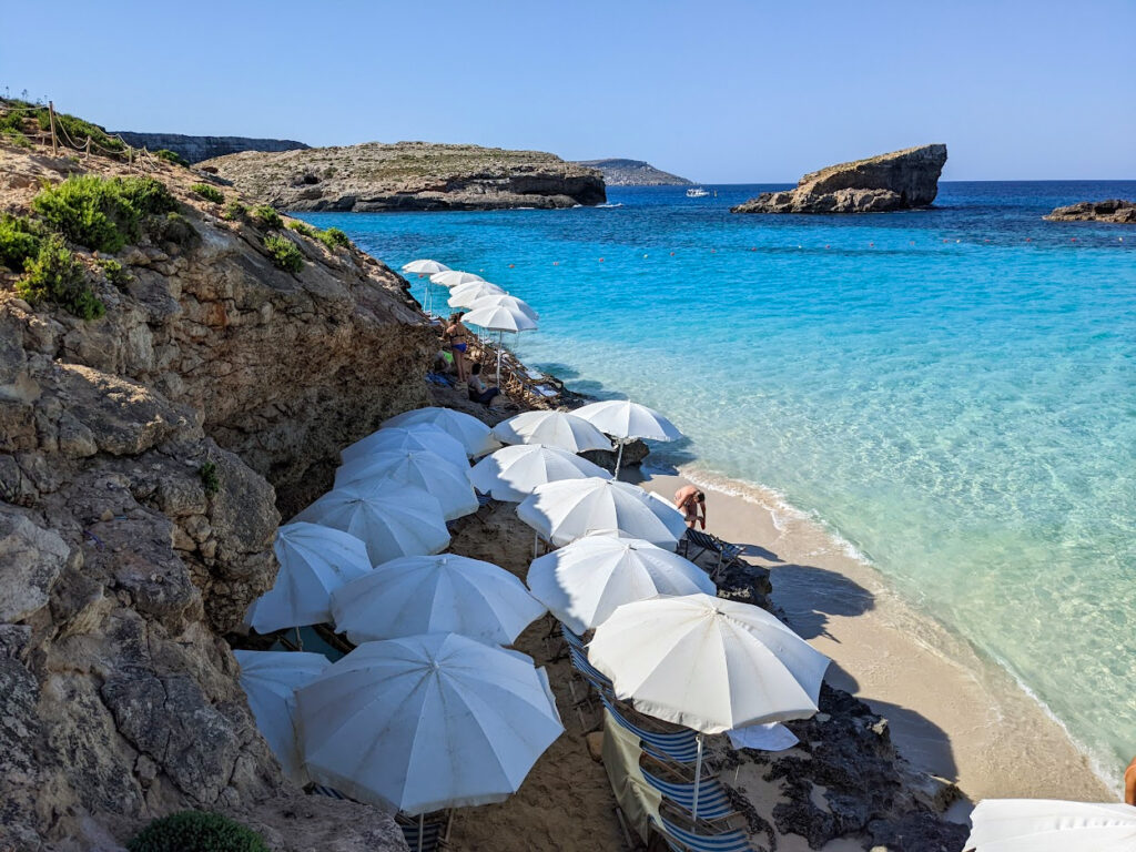Moviment Graffitti demands the government take urgent action to return the Blue Lagoon in Comino to the public and stop deckchair vendors from covering the entire shoreline with deckchairs and umbrellas.