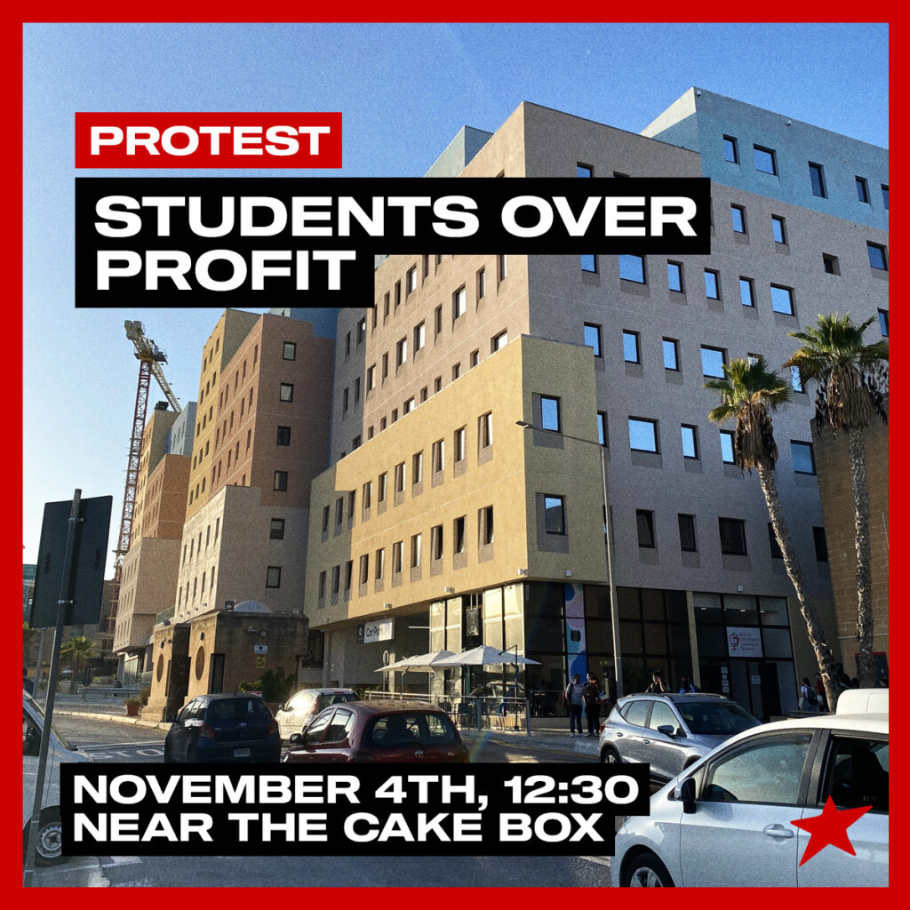 Moviment Graffitti will be, alongside a number of other organisations, protesting against the hyper-commercialisation of student life at the University of Malta. The protest will be held on Friday 4th at 12:30, in front of the Cake Box near Campus Hub. University students are constantly bombarded with materialistic, commercial values, with Campus Hub being the most visual culmination of this problem.