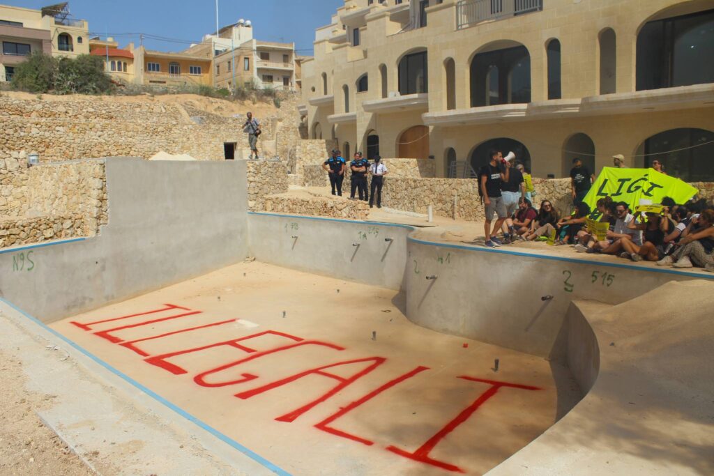 This affront to justice is facilitated by the Government and its authorities, who have consistently bent over backwards to satisfy the greed of developers. Last June, Moviment Graffitti conducted a direct action at the site of the two illegal pools, highlighting how the Government had systematically failed to curb Portelli’s bullying tactics and had failed to reform the deeply flawed planning appeals system. Current law permits developers to commence and complete projects even while an appeal is pending before the Planning Tribunal (EPRT) or the courts. As we see in Qala, this results in projects being fully built even after the courts revoke their irregular permits.