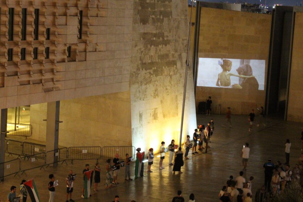 Yesterday, activists stood outside Parliament holding placards with information about the ongoing genocide in Gaza and projected images of the horrors unfolding there onto the wall next to Parliament.