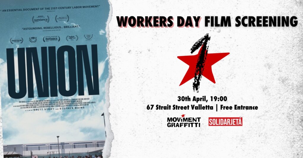 On the eve of Workers’ Day, Moviment Graffitti and Solidarjetà invite you to join them for a special screening of the award-winning documentary UNION! The screening will take place on Wednesday 30th April at 67, Strait Street, Valletta at 19:00.