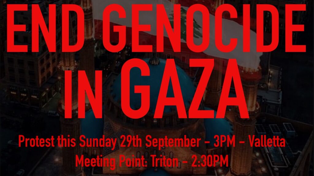 Meeting at 14:30 at Triton Fountain in Valletta to protest the Israeli aggression against Lebanon and Gaza. All peaceful protesters of all nationalities are welcome.