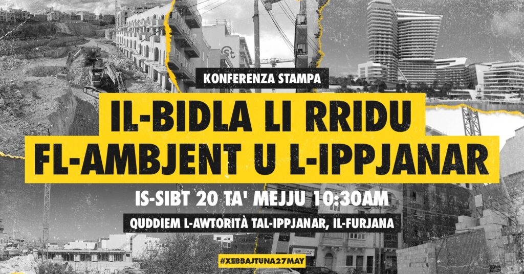 🟢 Ġimgħa qabel il-protesta nazzjonali Xebbajtuna! tas-27 ta’ Mejju, rappreżentanti ta’ komunitajiet u għaqdiet ser jindirizzaw Konferenza Stampa quddiem l-Awtorità tal-Ippjanar sabiex jispjegaw il-bidla urġenti li hawn bżonn fil-politiki tal-ippjanar, fl-awtoritajiet responsabbli mill-ambjent u l-ippjanar u fil-mudell ekonomiku ta’ pajjiżna.