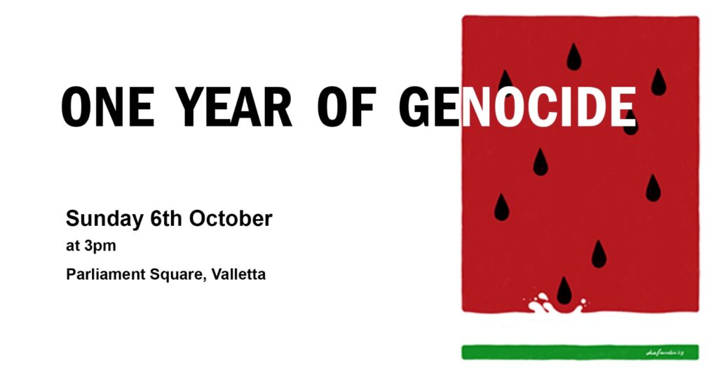 On Sunday, 6th October, we will gather in Parliament Square, Valletta, to express our outrage at this unspeakable injustice. We aim to continue participating in the global movement of solidarity with the Palestinian people and all those targeted by Israeli violence and oppression.