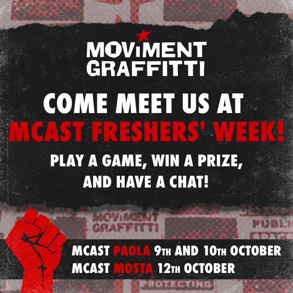 📍 Studenti Graffitti, the student wing of Moviment Graffitti, will be present at the MCAST Freshers’ Week 2023 on Monday 9th and Tuesday 10th October in Paola, and on Thursday 12th October in Mosta, between 8 a.m. and 1 p.m.