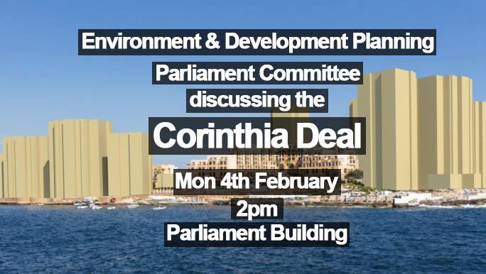 On Monday 4th February at 2pm, the Parliamentary Standing Committee responsible for the Environment and Development Planning will discuss the proposed Corinthia deal. The public is encouraged to attend this meeting. Please bring your ID Card with you as it is needed to access Parliament building. This discussion is being held following a request by […]